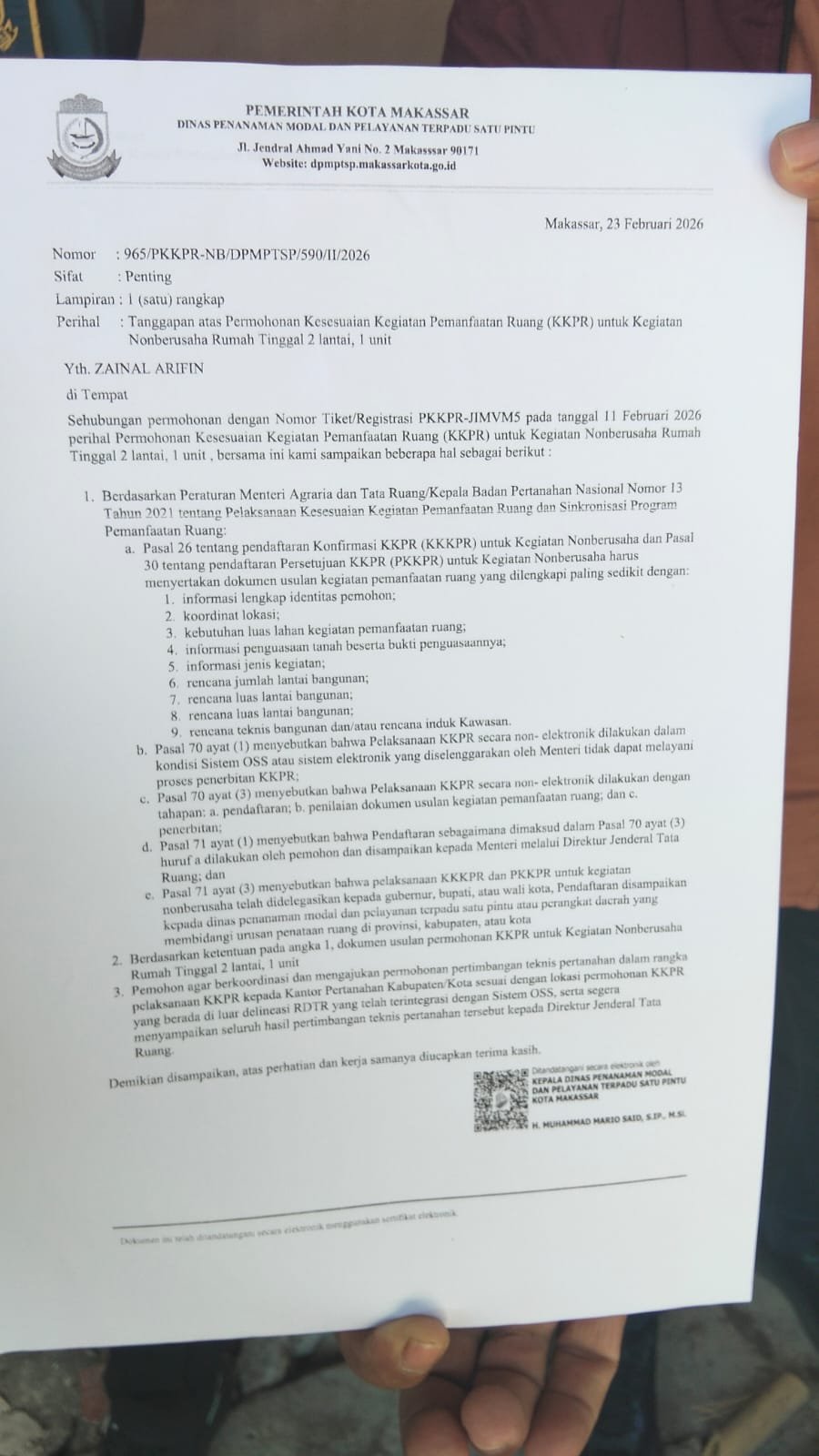 Informasi yang dihimpun menyebutkan, aktivitas pembangunan tersebut mendapat perhatian warga sekitar hingga dilaporkan ke pihak terkait. Menindaklanjuti laporan itu, petugas dari Dinas Tata Ruang Kota Makassar langsung melakukan peninjauan ke lokasi.